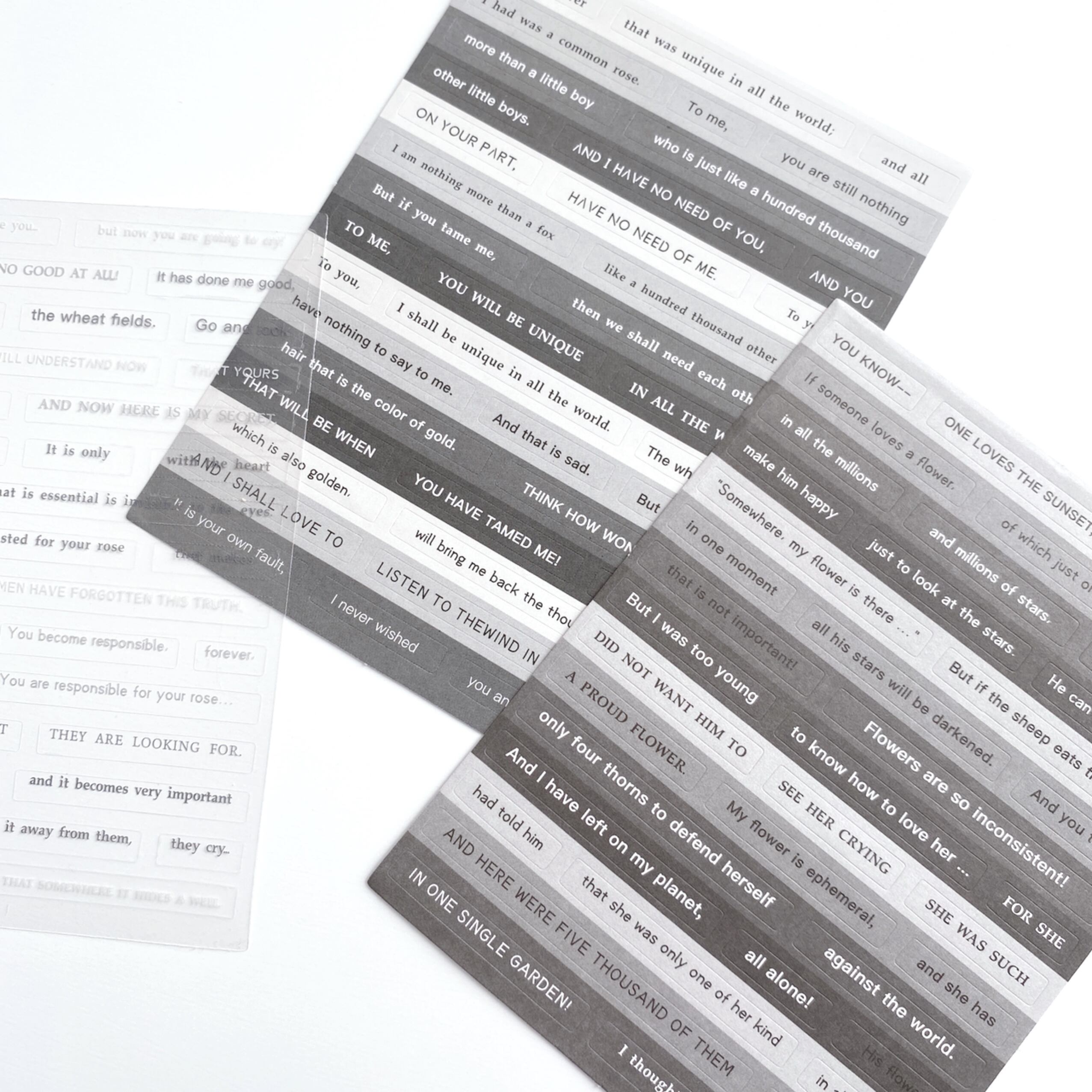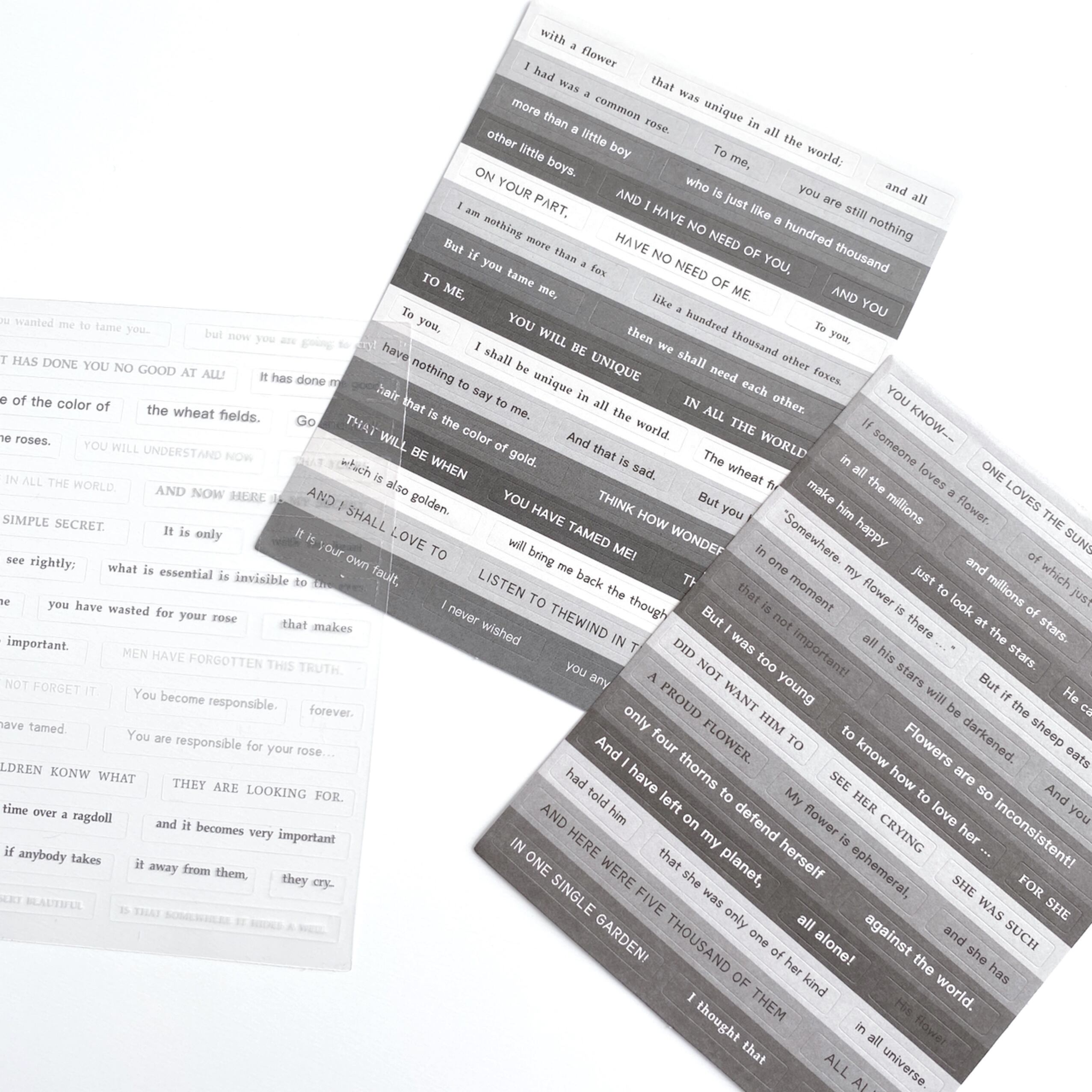 PVCの透明シールとコート紙、紙の3種類の素材が入った英文シールです。