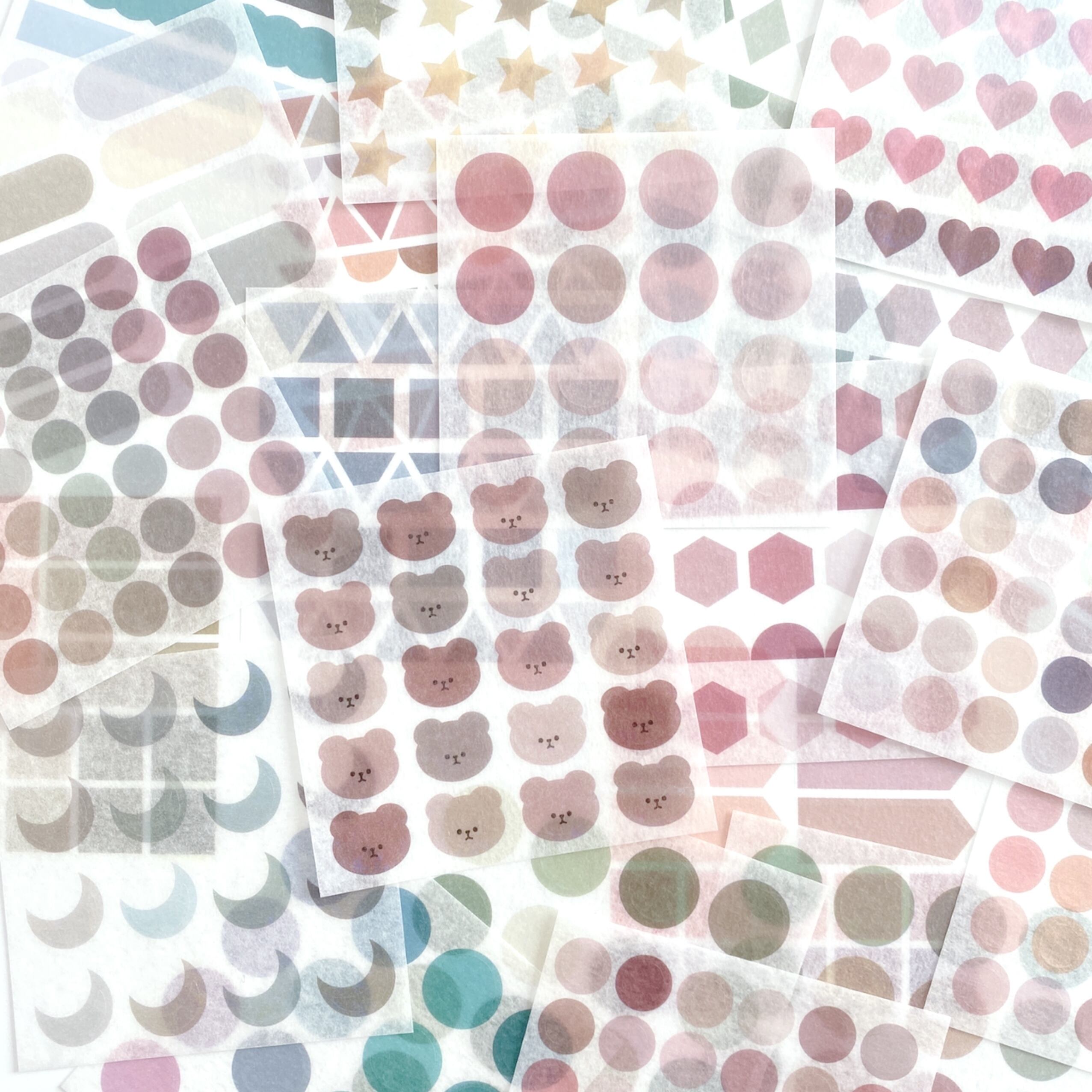 マスキングテープ素材でラウンドや星型やハート型、くまなどのさまざまな型のステッカーが入っています。
