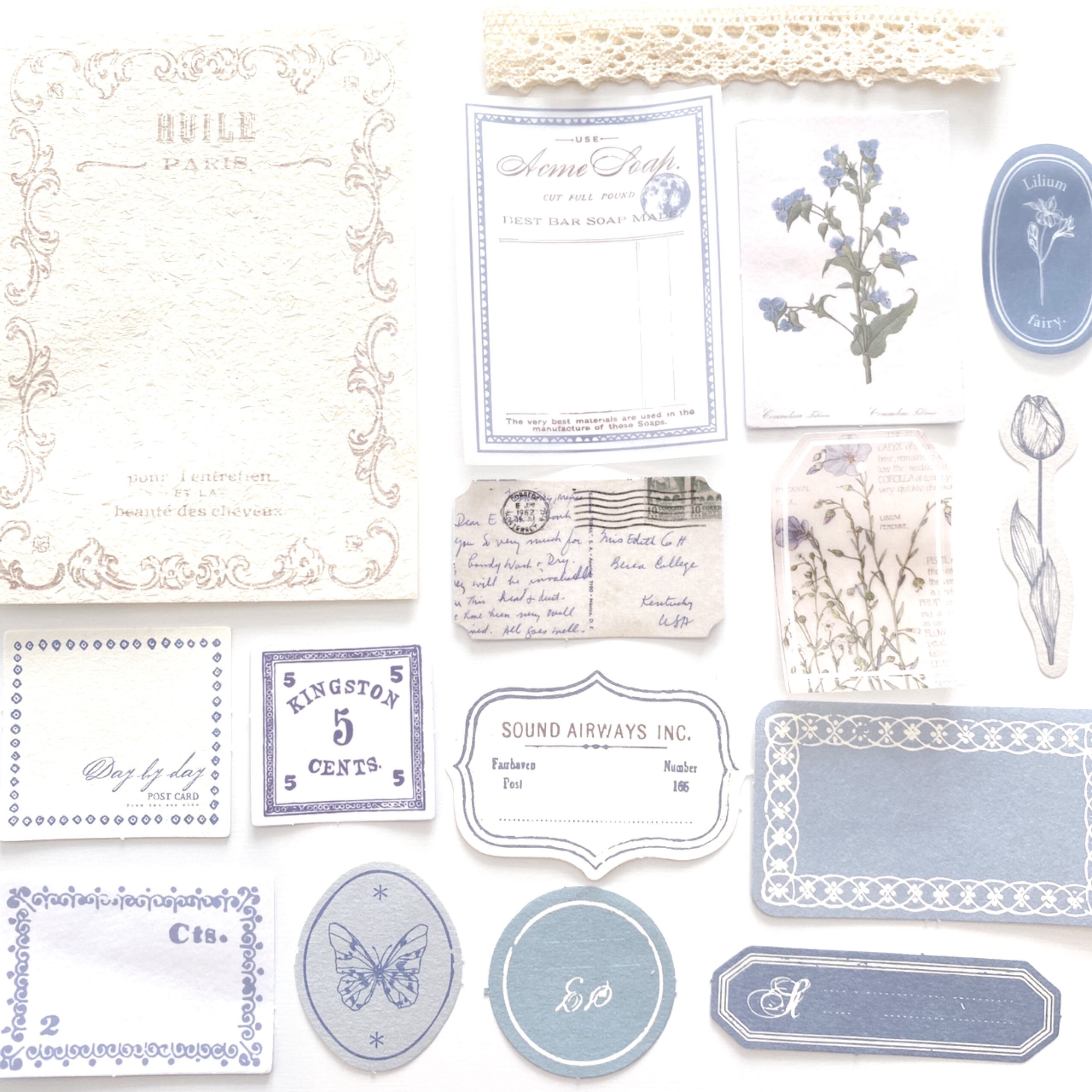紙の素材紙8柄、硫酸紙の素材紙3柄、紙素材のステッカー4柄とレースリボン1個が入っています。